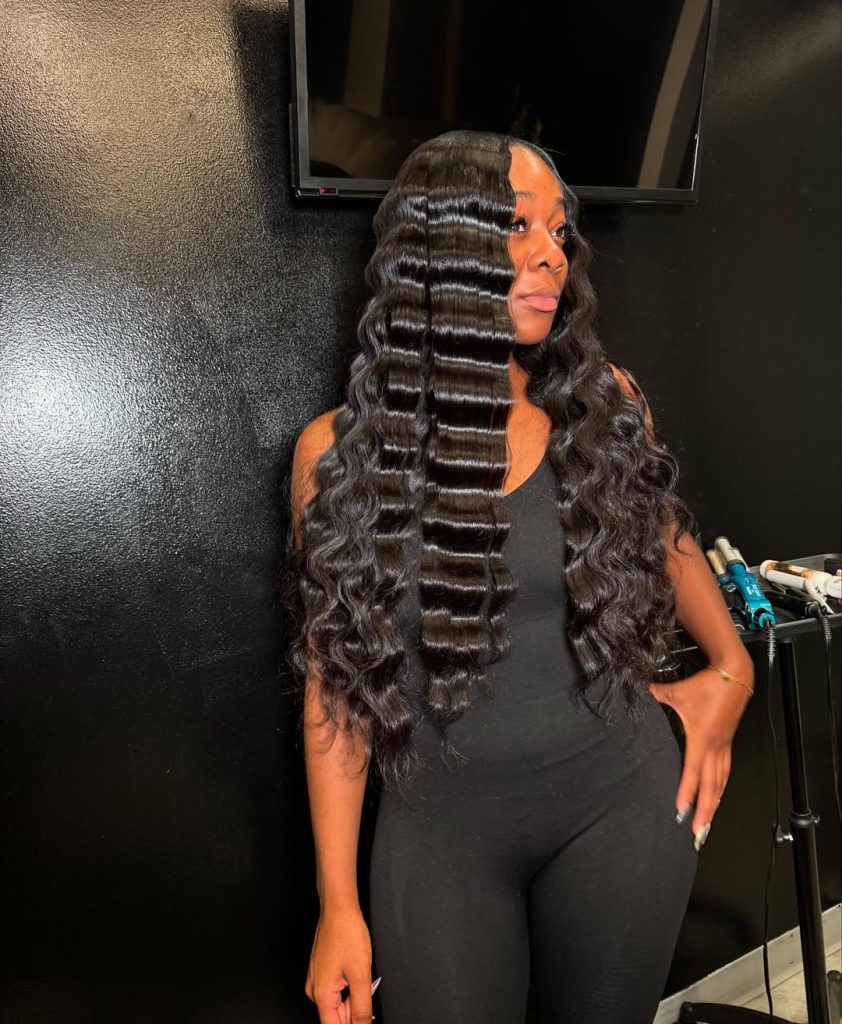 This is the modern glam quick weave: uniform, plush S-waves starting right below a crisp middle part and cascading to the bust. The finish is ultra-reflective—proof of a smooth mold and carefully brushed-out curls. Ask your stylist for layered wefts with a blunt micro-trim at the ends so the waves collapse into one seamless shape rather than separate coils.
