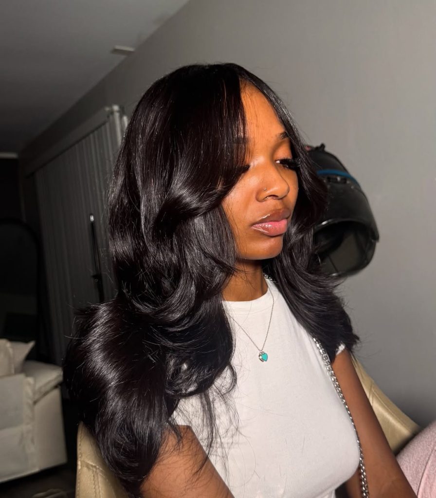 Feathered face layers and a soft middle part give this quick weave that effortless “curtain” sweep, while the lengths are beveled into airy flips that sit right above the chest—glossy, bouncy, and incredibly wearable. Ask your stylist to keep density light through the crown and stack a few shorter tracks around the cheekbones so the front frames the face without feeling heavy.