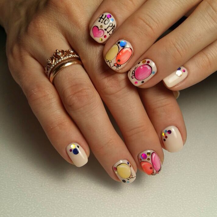 This short square manicure leans fully into cute birthday energy. A soft nude base keeps things grounded, while colorful balloon-style illustrations add a whimsical, almost hand-drawn charm. Tiny crystal accents give the set a celebratory sparkle without overpowering the look. It’s an easy choice for someone who loves fun, youthful ideas but still wants something age-appropriate and polished for 2026. Perfect for daytime parties or casual spring celebrations where personality matters more than drama.