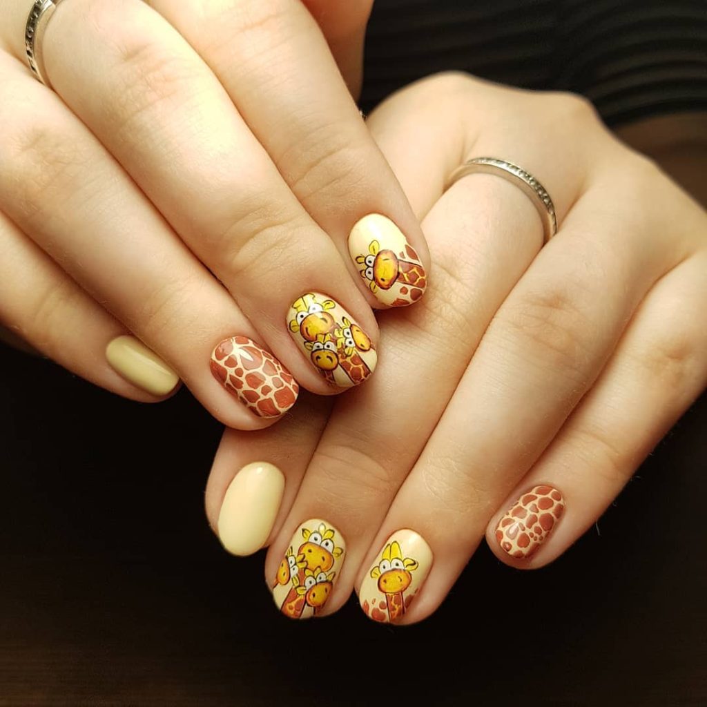 This manicure proves that birthday nails can be playful at any age. Soft yellow and warm neutrals create a cozy base for charming giraffe illustrations. The look feels lighthearted and artistic, making it a great simple option for spring birthdays spent with family or close friends. Nail artists often highlight illustrated designs like this as an easy way to make a birthday set feel personal without relying on heavy embellishment.
