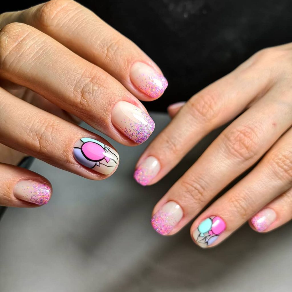 This short square manicure feels like a quiet celebration at first glance, then surprises with playful detail. A sheer nude base keeps the look simple, while soft glitter gradients at the tips add subtle sparkle that catches spring light beautifully. The balloon accent nails — outlined in pastel pink and blue — bring in unmistakable birthday fun without tipping into childish territory. It’s an ideal gel choice for women who want cute yet polished ideas for a low-key spring birthday lunch or casual dinner.