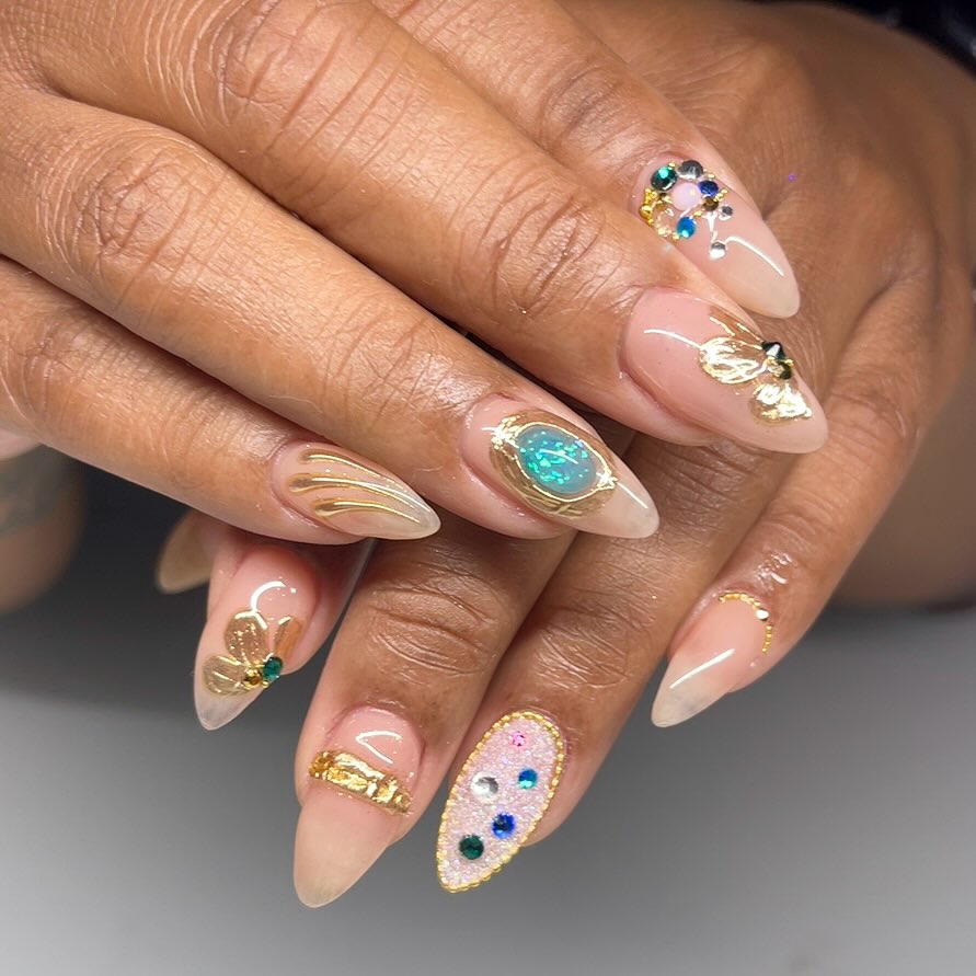 This almond manicure blends luxury and artistry. A sheer nude base creates the perfect canvas for sculptural gold accents and jewel-toned crystals in green and blue. The look feels custom, almost like fine jewelry for the hands. Ideal for milestone birthdays or evening celebrations, this gel set speaks to women who prefer refined glamour over playful themes. It’s bold, feminine, and unmistakably intentional.