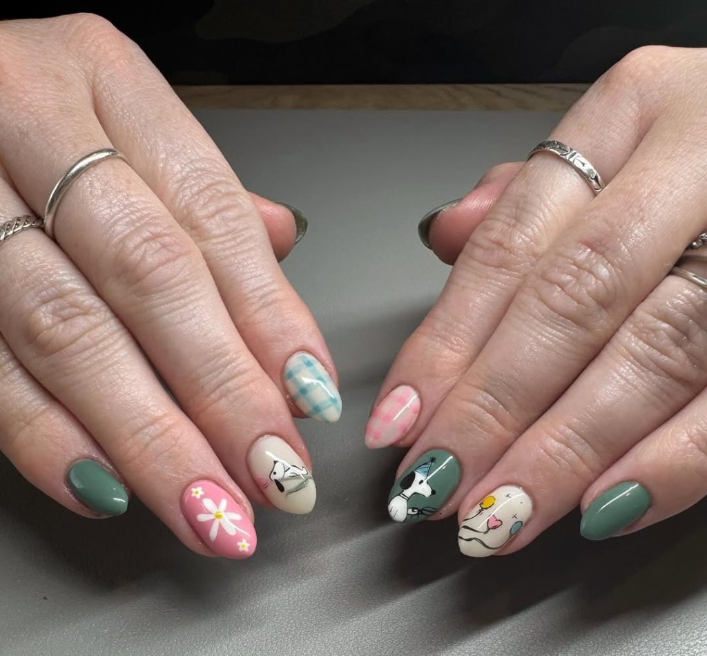 This manicure feels like spring itself — lighthearted, artistic, and full of charm. Soft neutral bases are paired with hand-painted florals, gingham patterns, and illustrated accents, creating a mismatched yet cohesive set. Perfect for women who enjoy storytelling through their style, this look works beautifully on short almond nails. It’s an easy, joyful choice for daytime birthdays, brunch celebrations, or casual spring gatherings.