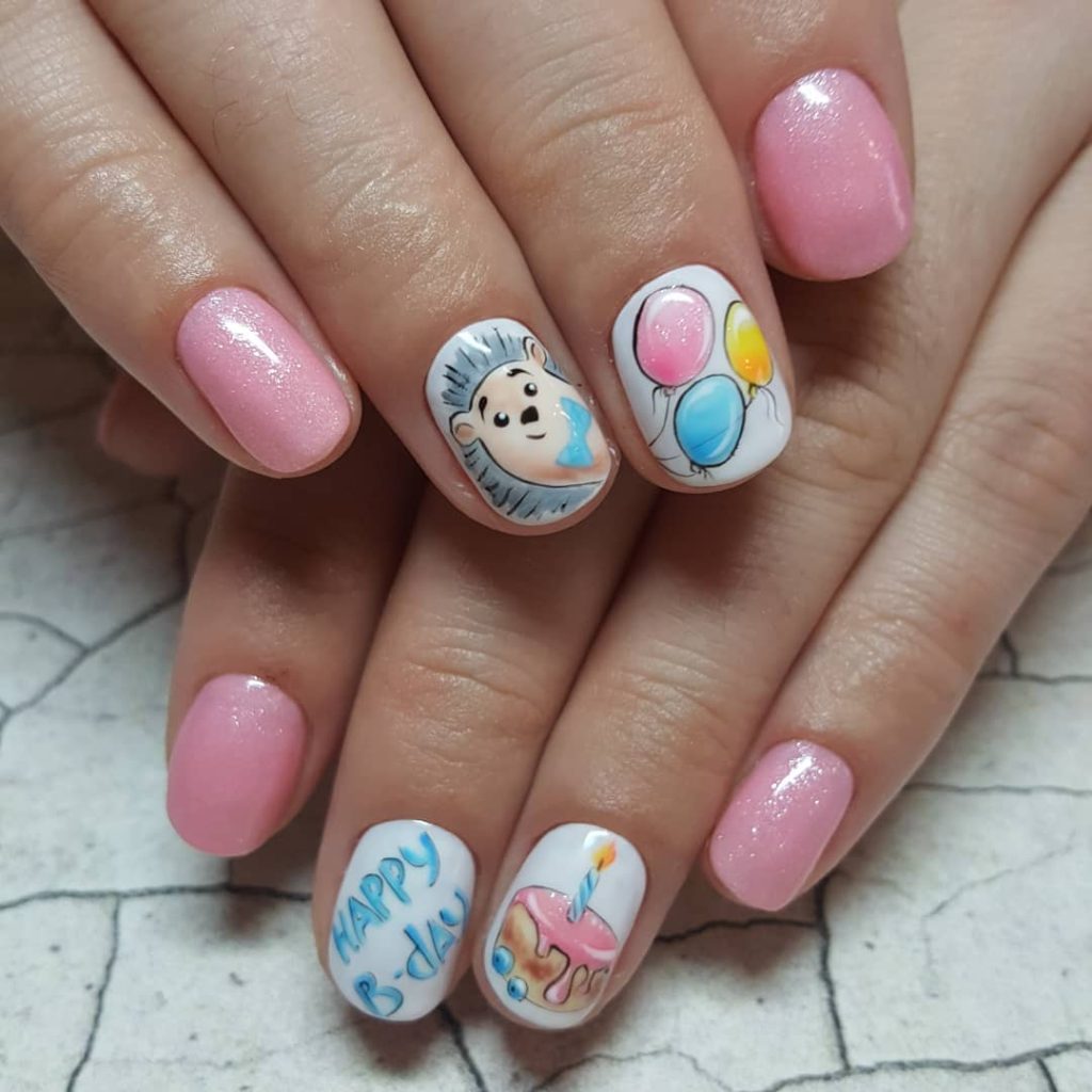 Pink Birthday Nails With Hand-Painted Cake Details