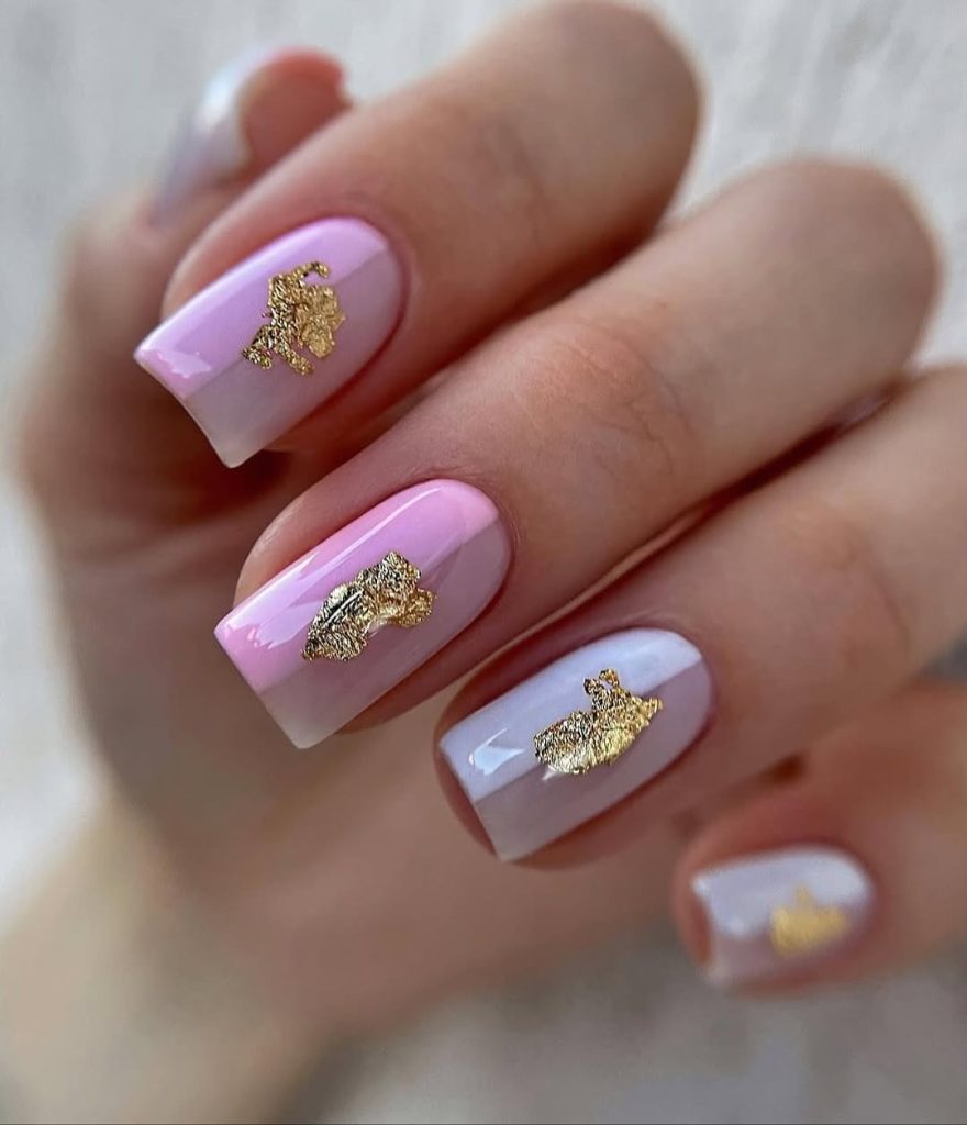 Pink And White Nails With Gold Foil Accents