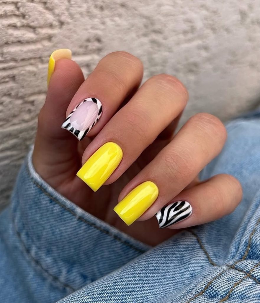 This bold yellow manicure closes the collection on a confident note. High-gloss yellow nails bring instant energy, while black-and-white graphic accents add contrast and structure. The look feels playful yet fashion-forward — perfect for women who embrace colorful birthday moments and love standing out. Best suited for spring birthdays that edge into summer, this set ideas option pairs effortlessly with denim, crisp whites, and statement accessories.