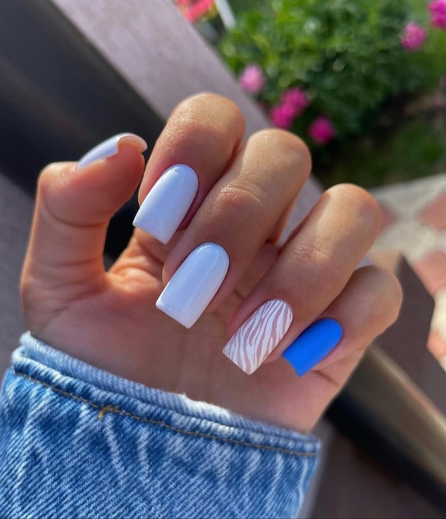 This manicure balances calm and contrast beautifully. Milky white and soft blue nails create a clean spring base, while a single accent nail features a subtle zebra-style graphic pattern that adds visual interest without overpowering the look. The square shape keeps the design modern and wearable, making it ideal for women who want birthday ideas that feel fresh but not overly decorative. It’s a great option for casual spring celebrations and effortless everyday style.