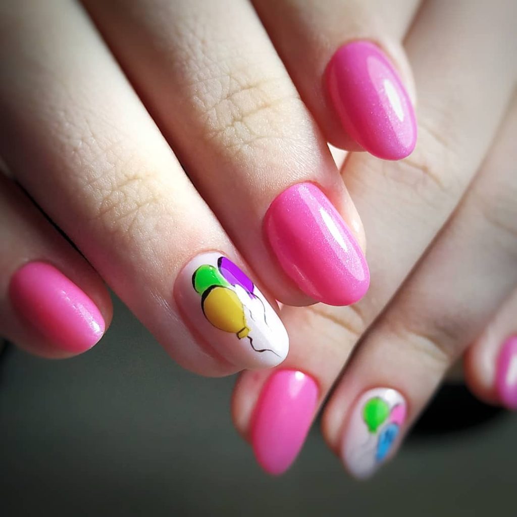 Hot Pink Birthday Nails With Balloon Art