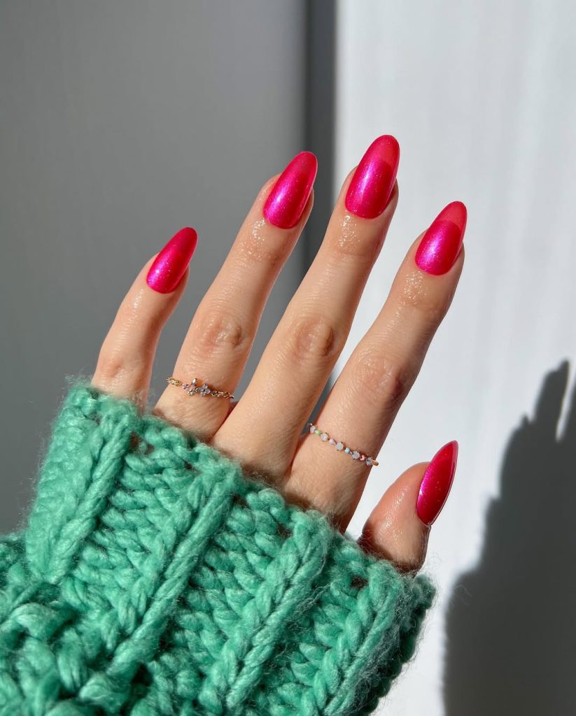 Hot Pink Chrome Almond Nails