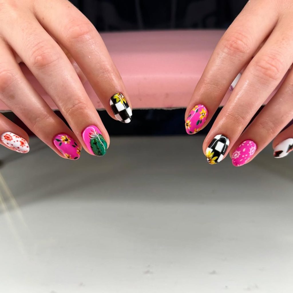 This set is what I’d call “spring break personality nails”—every finger tells a different story. Bright pink base accents, abstract florals, a bold black-and-white graphic nail, and tiny details that feel inspired by retro resort prints. It’s not trying to be subtle—it’s unapologetically fun and creative.