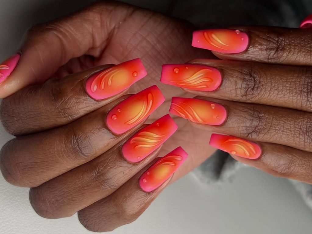 These long coffin nails are basically spring break turned into a manicure. The neon orange-to-pink base has a hot gradient glow, and the flame-like swirls add motion and drama—like heat waves on a sunny boardwalk. The design feels early-2000s revived in the best way (which lines up with what trend forecasters have been saying about playful “nostalgia glam” returning strong in 2026).