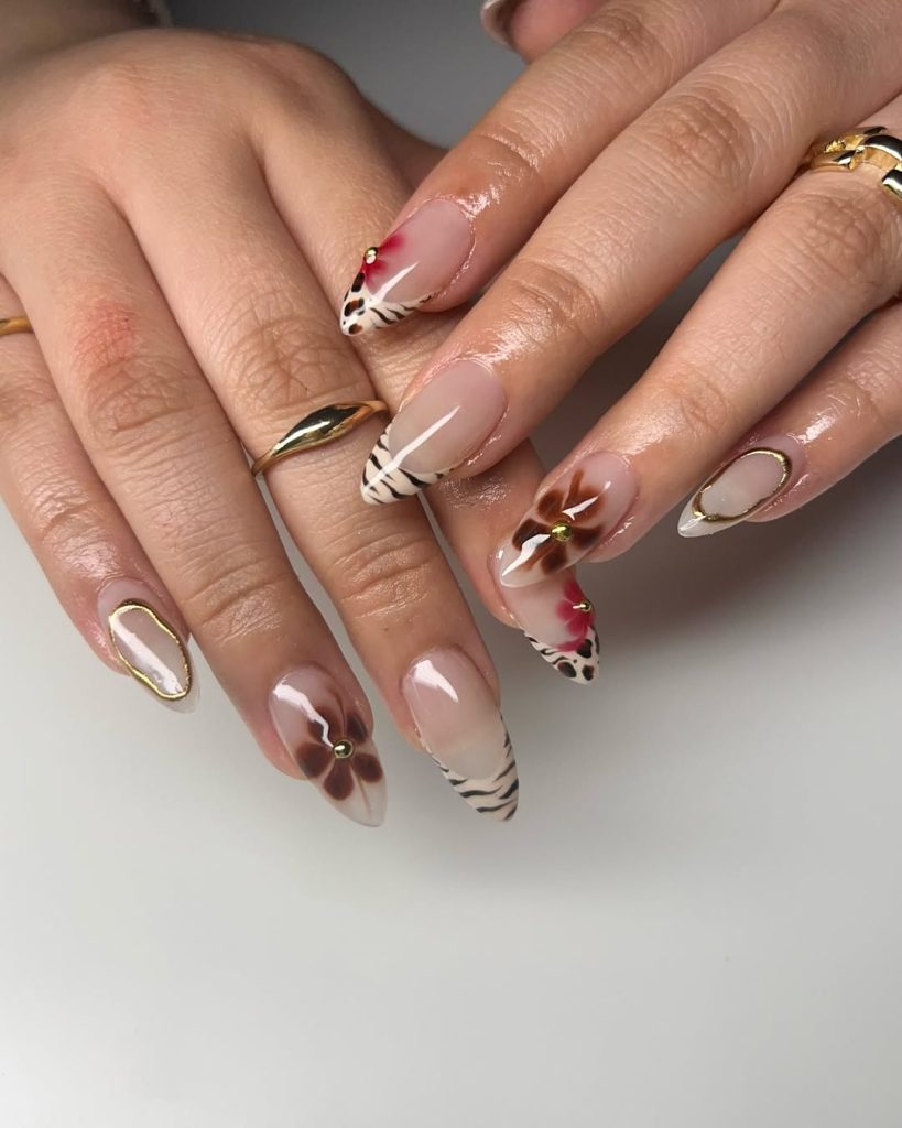 This set is a beautiful mix between an understated mani and something more badass—great if you’re looking for spring break nails that still feel elevated. The base is glossy nude (any shade will do), but with sharp French-tip shapes and zebra striping layered over it. And then the floral accents soften and bring a touch of playful romance.