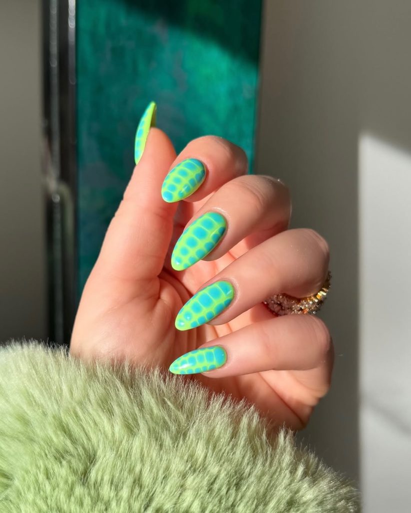 If “poolside glam” had a manicure, it would look exactly like this. The base is a bold turquoise-blue with neon green edges, topped with a subtle scale-like pattern that instantly gives mermaid vibes. The long almond shape gives the look a glossy and modern feel, and the color combo will have you on vacation—or make you want to (paging dosages of tropical water in direct sunlight).