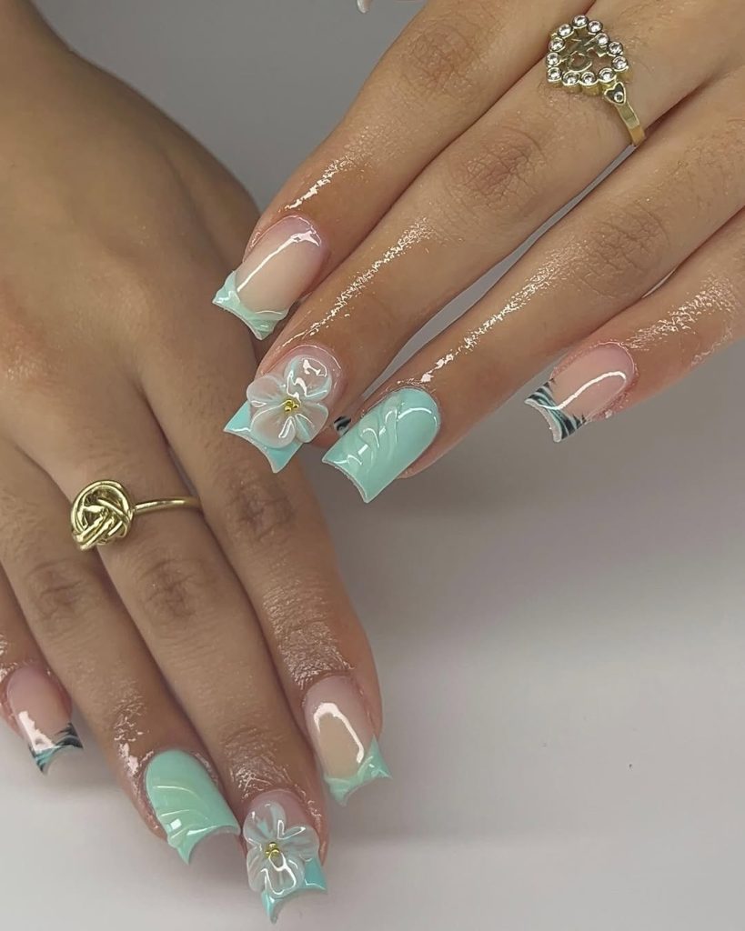 This design features mint square French tips adorned with 3D flowers.