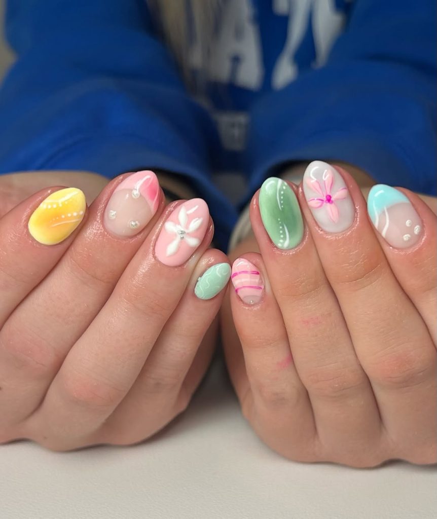 Mixed Pastel Short Nails With Floral Details