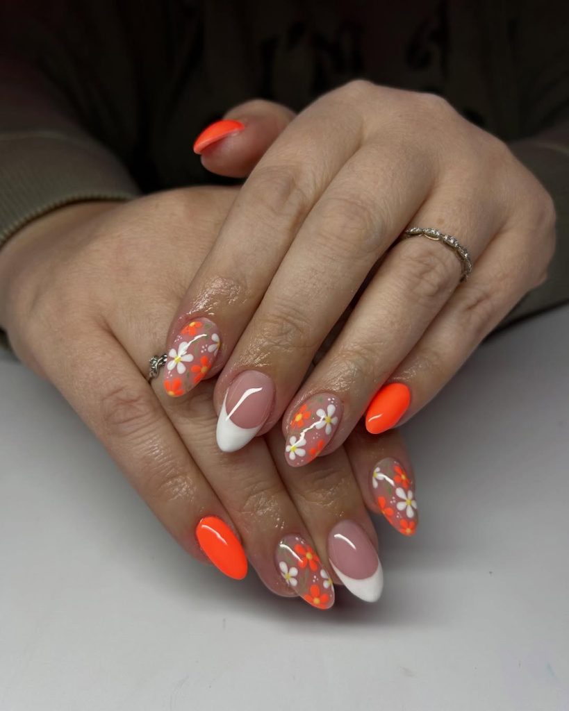 This look is a full vacation mood: bold neon orange solids paired with floral accent nails on a translucent base. It’s playful but still balanced—especially because the daisies are kept crisp and graphic, with bright orange dot details that tie everything together. The overall shape reads like a medium almond/soft oval, which keeps the vibe feminine and elevated.