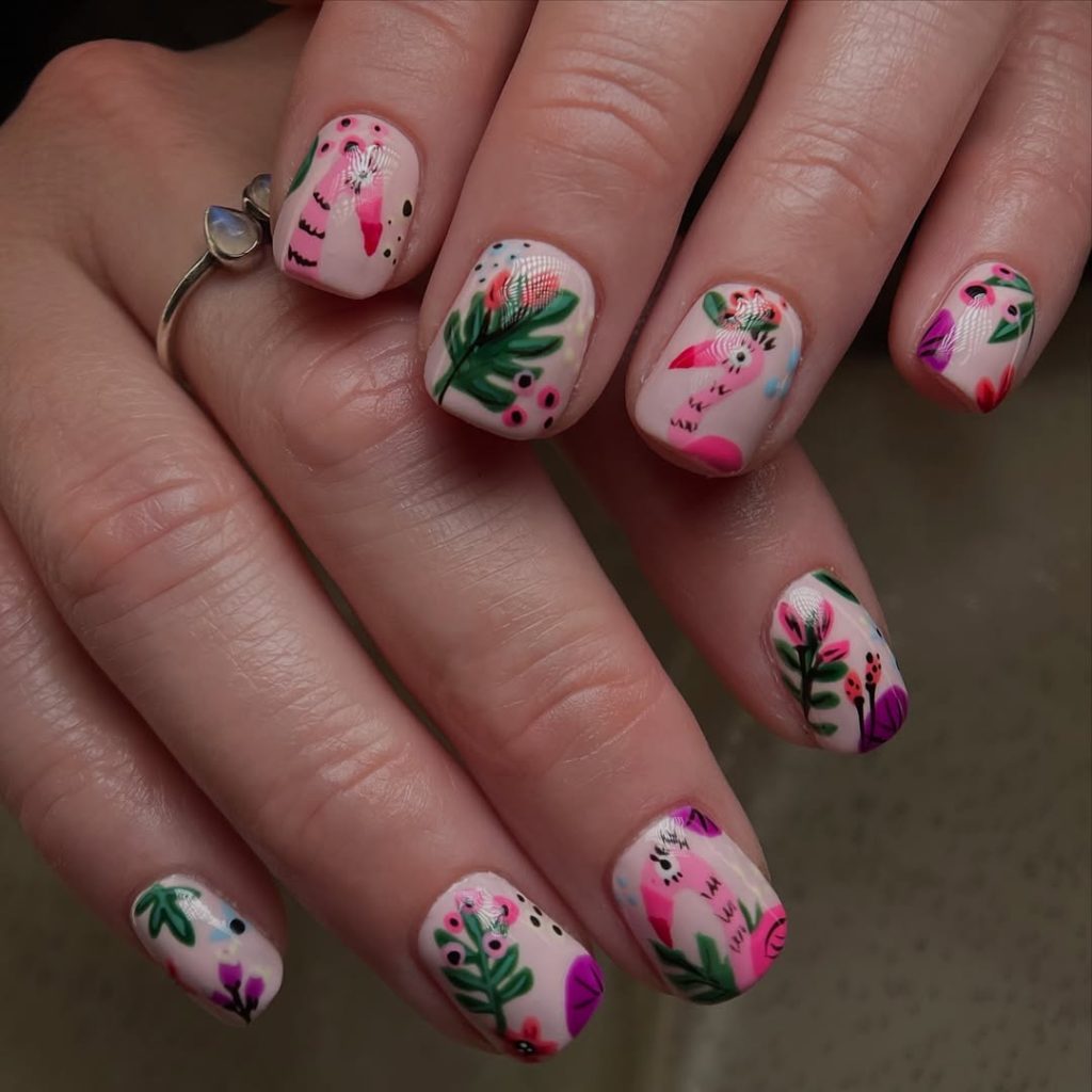 Short Botanical Spring Break Nails With Playful Pink Art