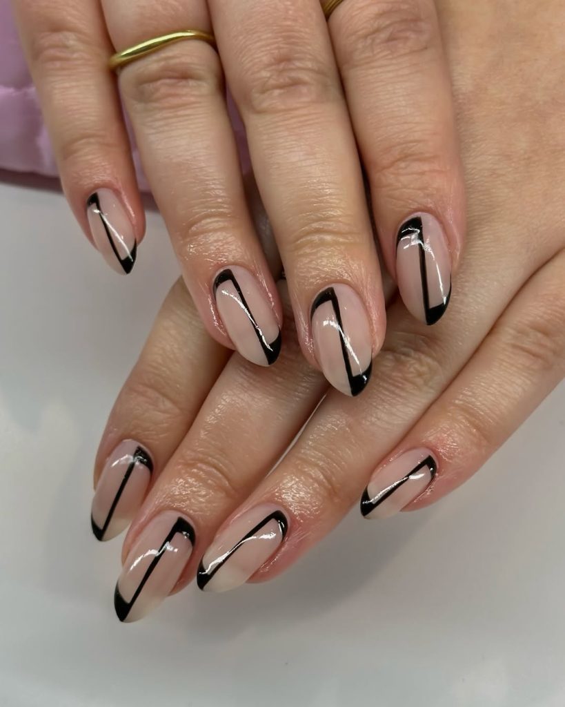 Classy Black French Tip Almond Nails With Graphic Lines