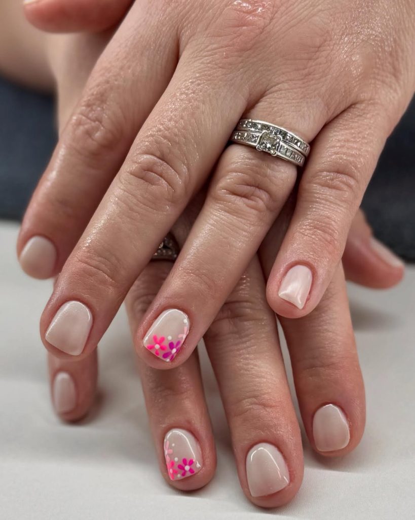 Minimal Nude Short Nails With Tiny Pink Flowers
