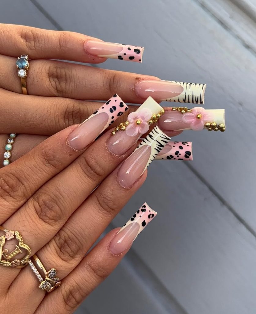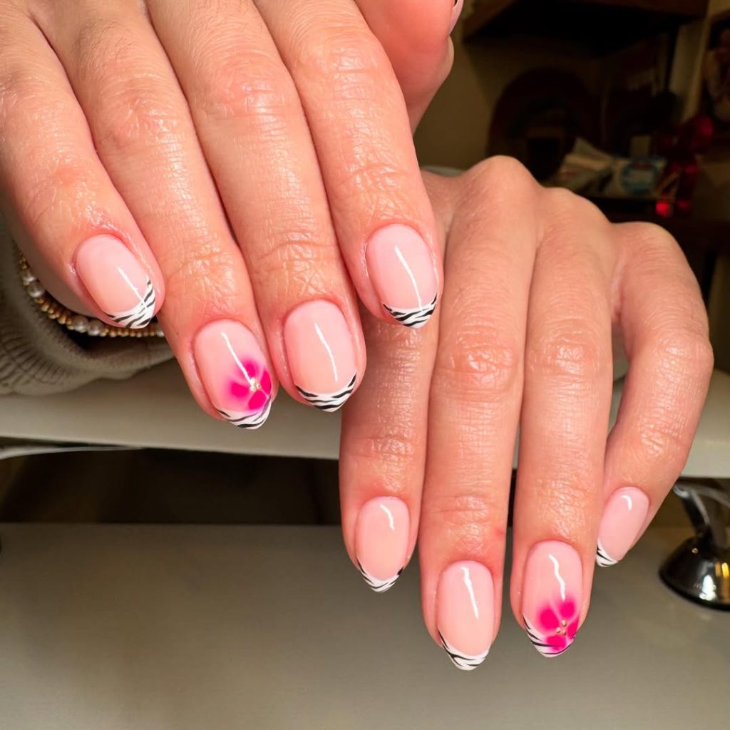 This design is where classic meets bold: a soft blush base, crisp French tip edges, and the most exciting detail—zebra striping near the tips plus a bright pink “pop flower” accent nail. It’s the type of manicure that looks like you planned your entire trip around it (in the best way).