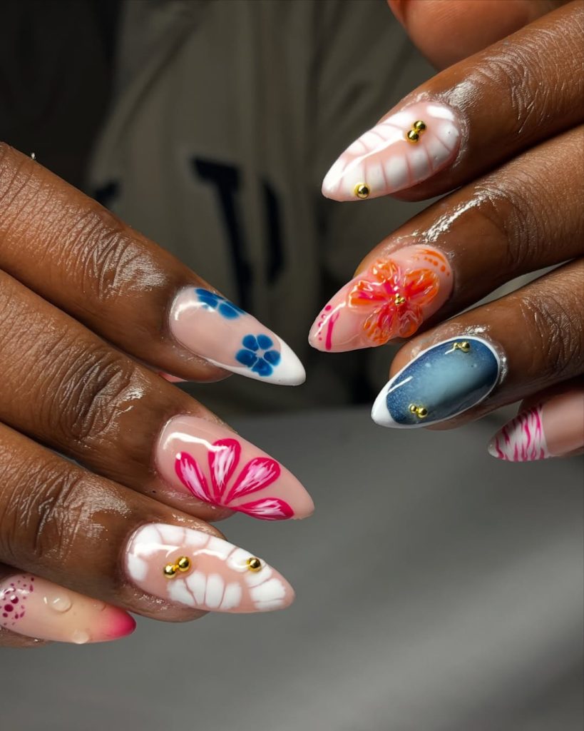 This set feels like a spring break postcard—hand-painted details in pink, coral, and yellow over a soft nude base. The designs include cheerful flowers, dotted accents, and abstract swirls that look artsy but still clean. The overall vibe is youthful, bright, and totally vacation-ready, while the almond shape keeps it feminine and flattering.