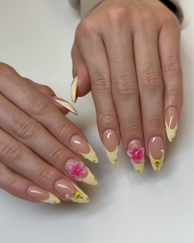 This set nails that “sweet-but-grown” energy that’s trending hard for 2026: sheer nude base, buttery lemon French tip edges, and delicate embellishments that feel like resort jewelry. The almond is long and narrow, flattering the fingers for a stylish look. 3D pink blooms (with gold centers) add a tropical, feminine vibe—like something you’d wear for a weekend getaway to Florida—while pearls and small gold details ensure it’s luxurious. That’s another one of those easy, classy styles that, if done right, still reads cute and high-end at the same time. If you love detail but don’t want confusion, then this balancer of both is the blueprint.