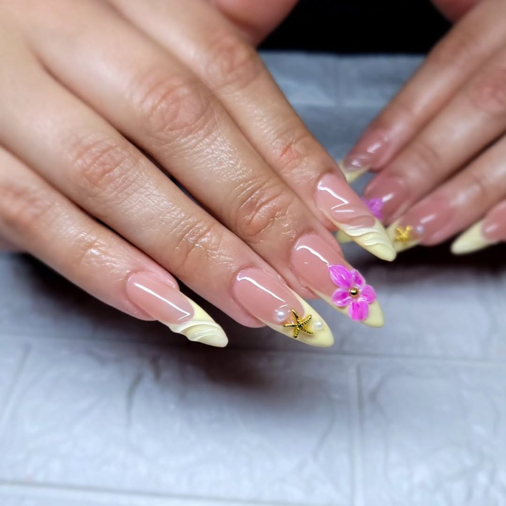 This is the manicure for the woman who wants spring break nails… without looking like she tried too hard. A creamy nude base keeps everything polished, while the tiny neon-pink floral corners add a subtle vacation detail. It’s minimal, clean, and incredibly flattering on the hands.