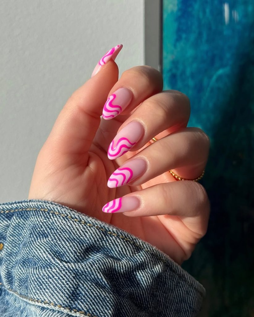 The design features hot pink swirl French tips on a soft nude base.