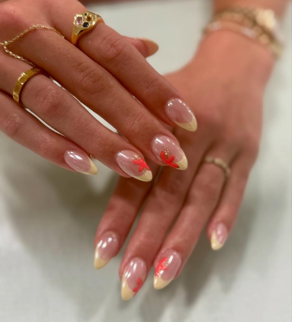 If you’re going for Florida beach energy, this is the set. It looks wonderful with bronzy skin, gold jewelry, and warm-weather styling. Think: coral lip tint, messy bun, oversized sunglasses. Ask for gel colors in a true neon orange (not red-orange), and have the floral accents tucked underneath a glossy topcoat to make your nail surface high-glossy.