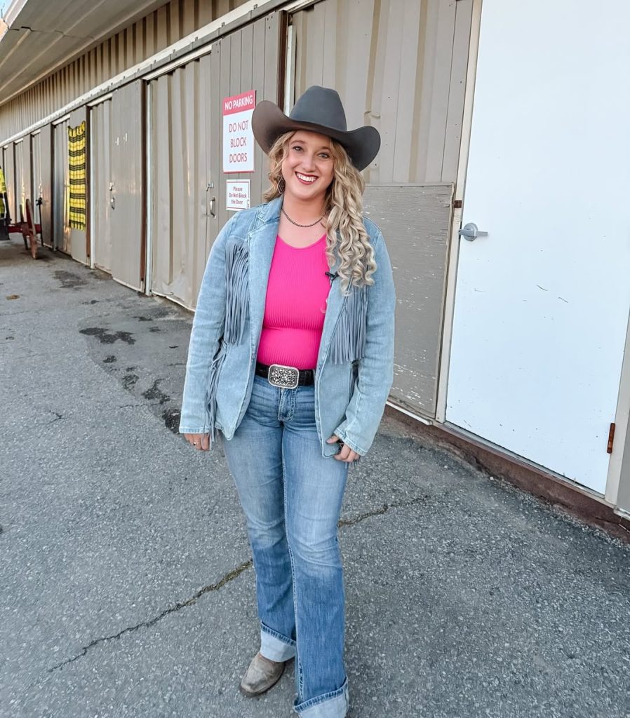 If you’re the type of woman who loves bright colors and isn’t afraid to stand out in a crowd, this punchy, fringe-lined combo is absolutely educational in punchy Western styling. It’s the perfect combination of bright and bold on top, paired with good old denim and a rigid hat—that’s cowboy-ready but still easy enough to pull off and look casual.