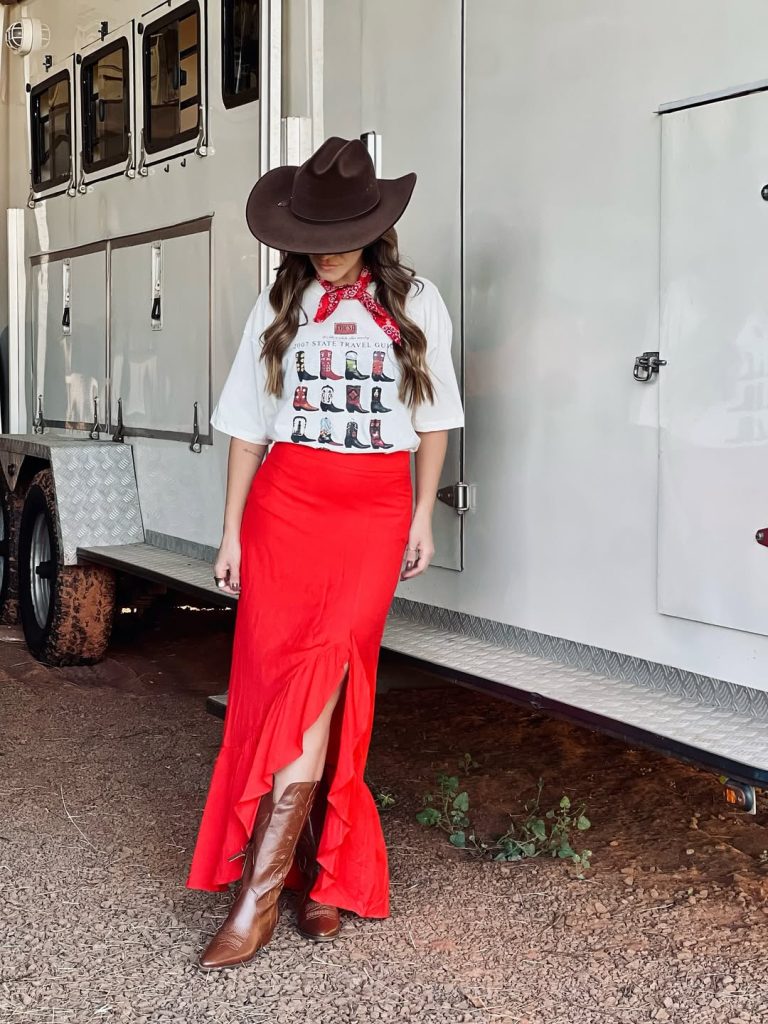 A graphic Western tee tucked into a fiery red skirt strikes that perfect balance between playful and polished. This outfit is all about motion, drama, and a hint of vintage rodeo poster charm—ideal for women who want women’s party looks with character.