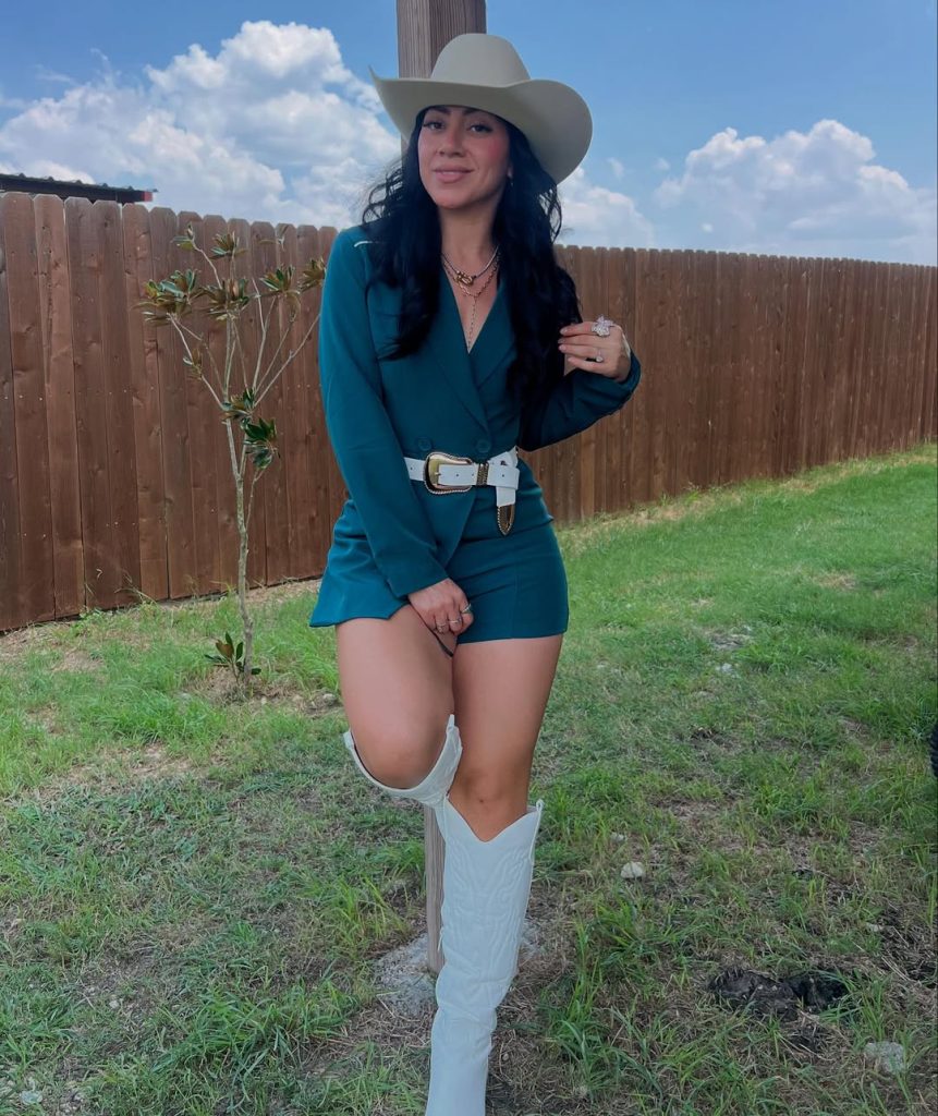 Tailored suiting meets cowgirl flair in a teal romper set that feels sharp, playful, and ready for any women’s party on the calendar.