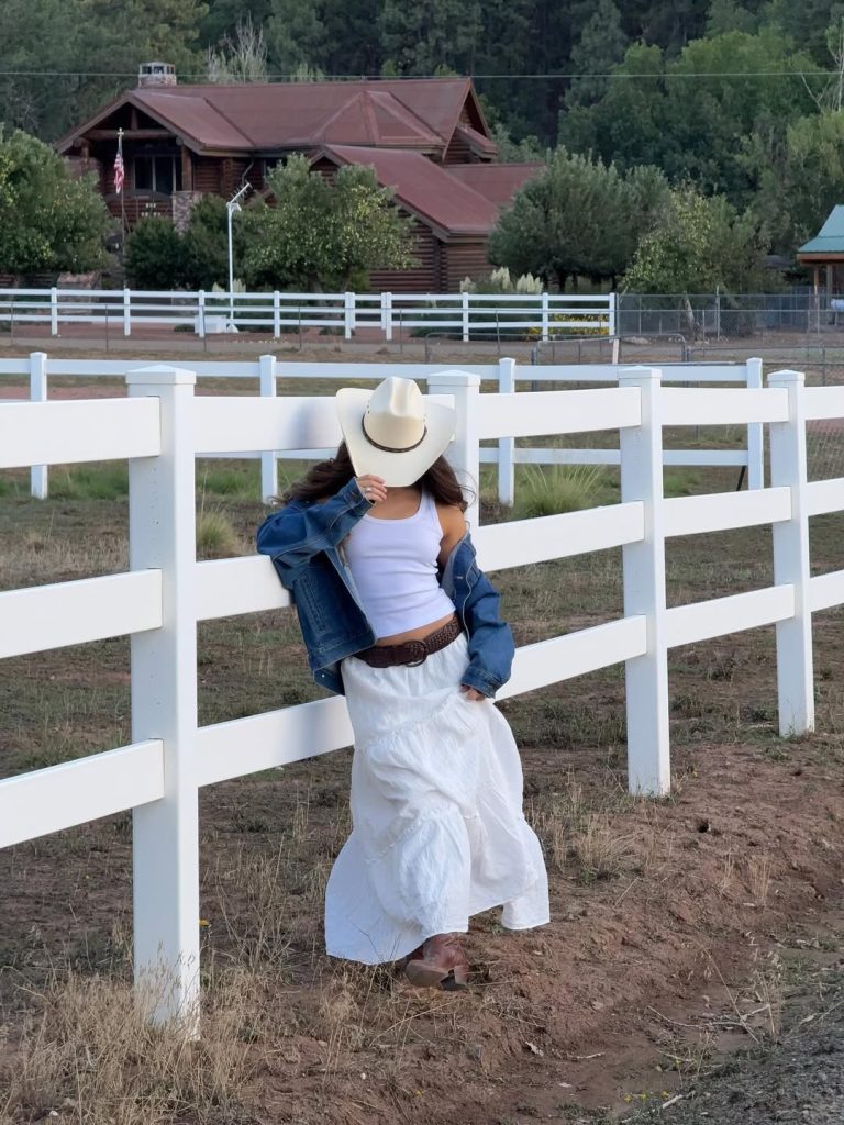 A breezy white skirt, cropped tank, and denim jacket create a laid-back Boho silhouette that feels perfect for slow women’s summer evenings and relaxed ranch visits.