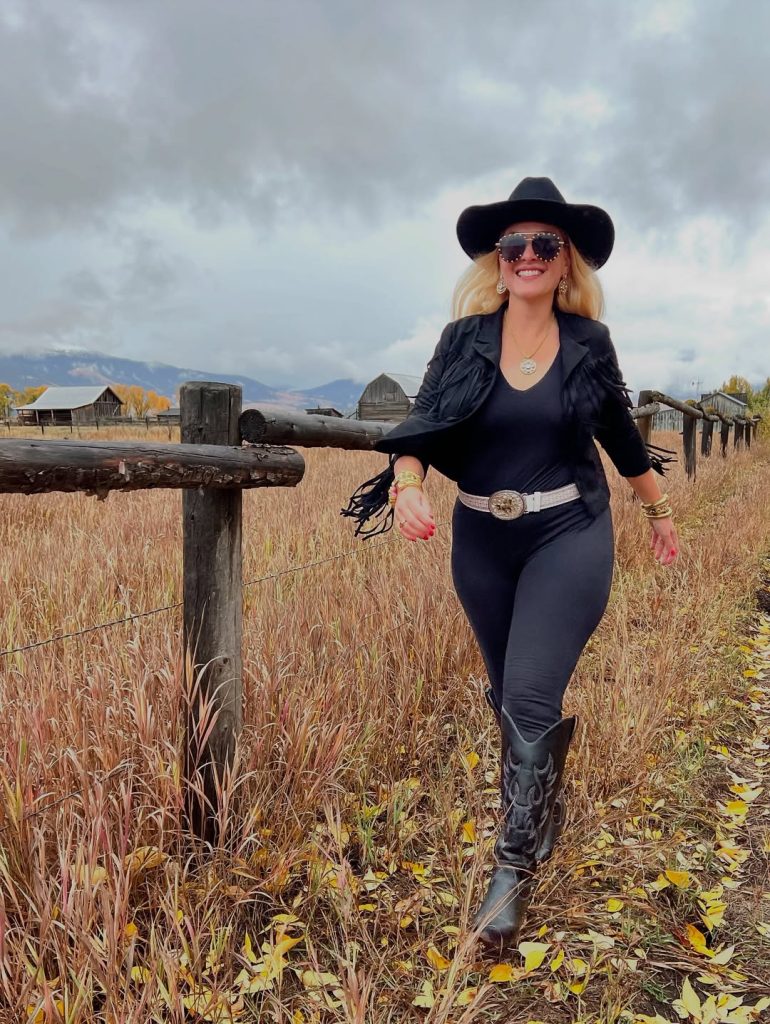 Head-to-toe Black with fringe and metallic accents delivers bold, confident energy—perfect for women who want a standout women’s fall look that still reads undeniably cowgirl.
