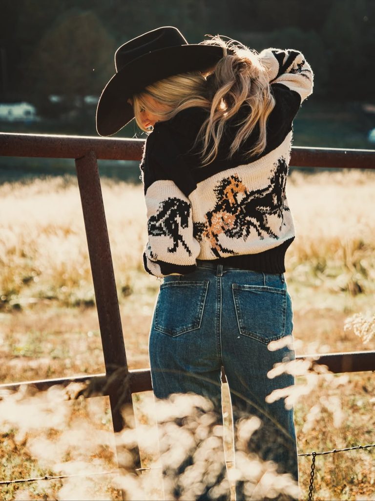 Soft knits, warm browns, and classic jeans create a gentle cowgirl look that feels intimate and quietly romantic—perfect for horse lovers.