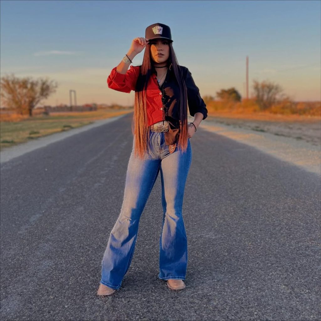 A bold half-red, half-black shirt, flared denim, and a snapback cap create a modern, punchy spin on classic cowgirl energy.