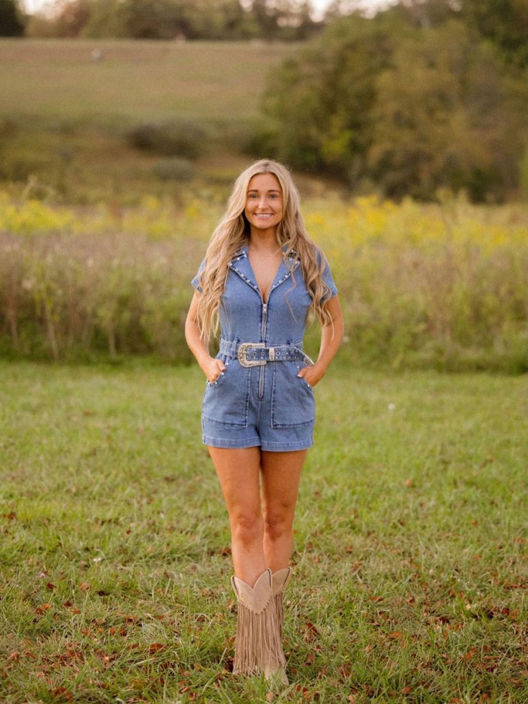 A belted denim romper and high fringe boots give this look playful, festival-ready charm—equal parts Cute and practical for active women.