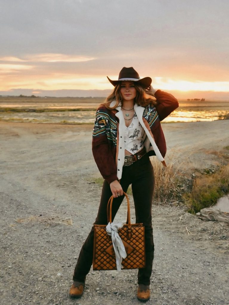 Picture this at road-trip stops, art fairs, or sunset photo sessions—anywhere a polished yet adventurous look fits in. To personalize, switch the scarf on the bag for a bandana in your favorite color or add stacked bracelets. I’d avoid tiny clutches or sporty backpacks; the structured tote balances the outfit and makes this one of the most versatile western outfits for women moving between town and open country.