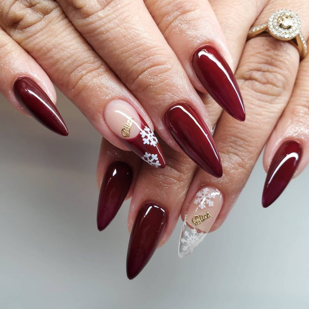 Deep Burgundy Snowflakes on Almond-Stiletto