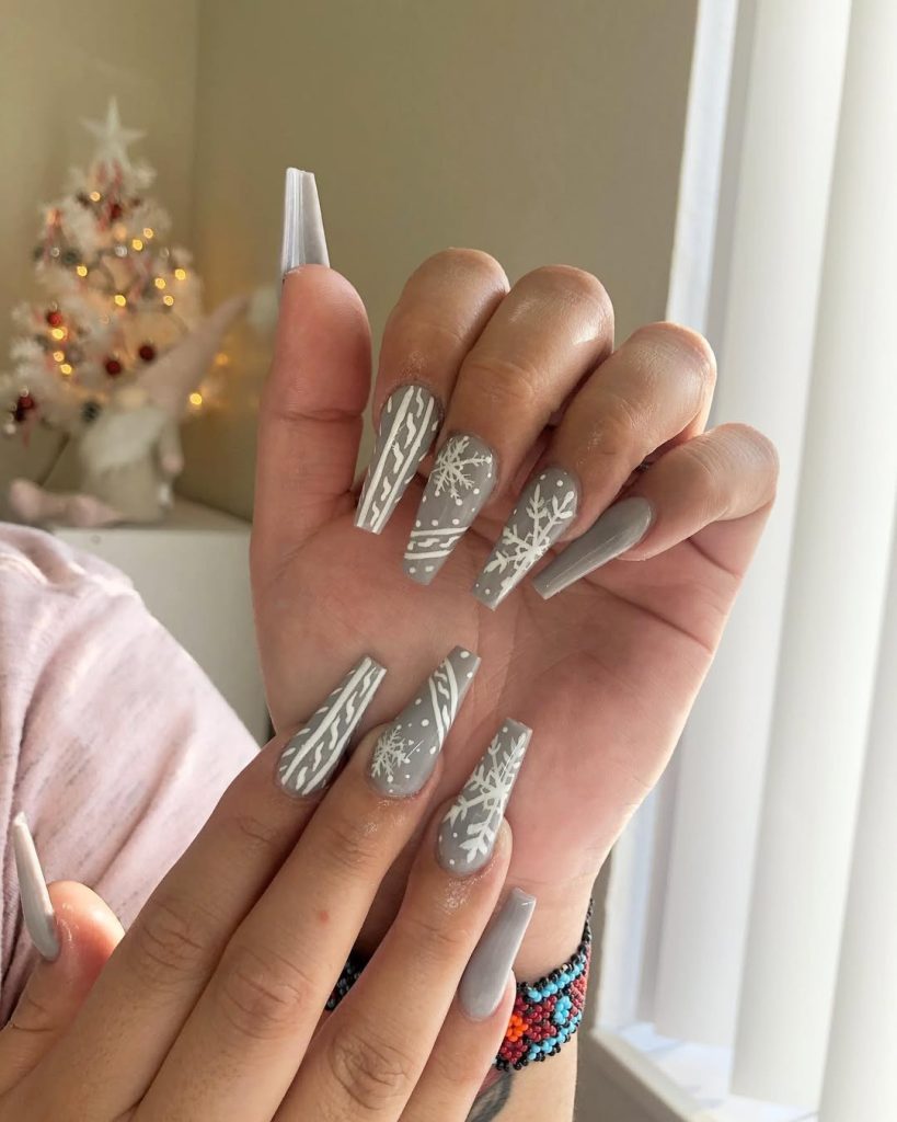 Soft dove-grey acrylics look cozy on their own; add sweater-stitch striping, tiny dots, and crisp white snowflakes and you’ve got a winter capsule in manicure form. The long coffin silhouette keeps the look modern.