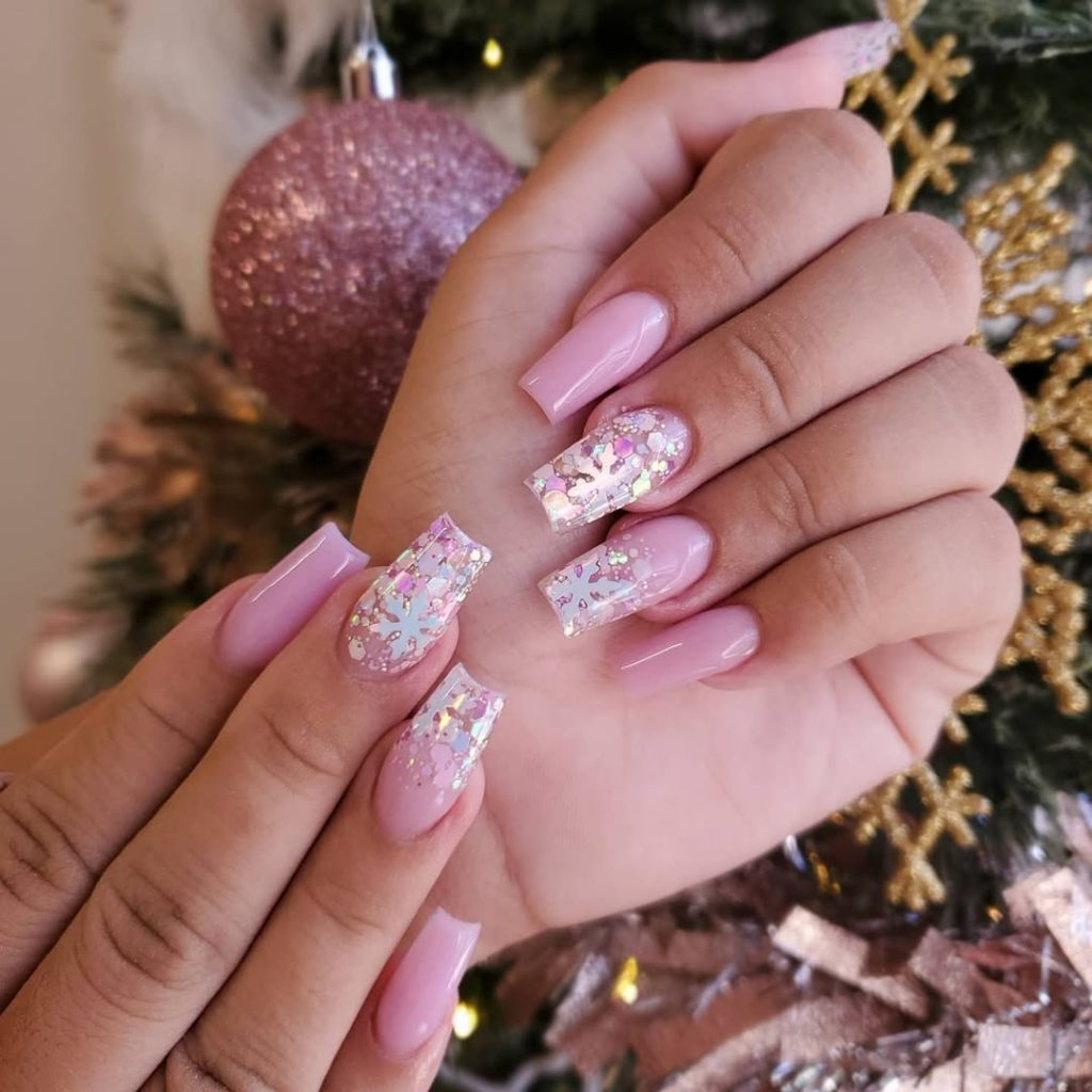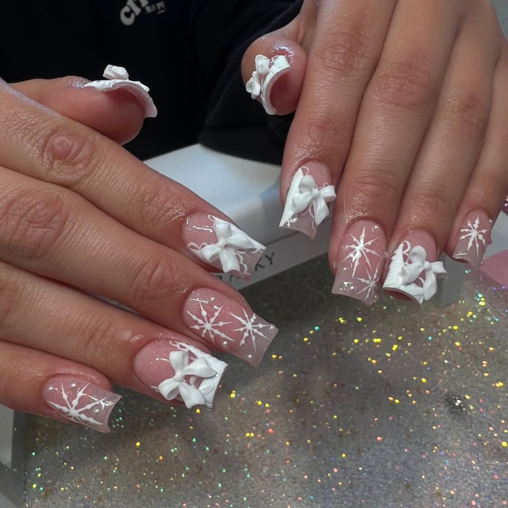 Snow-kissed sparkle meets present-perfect bow charms on a sheer blush base. The medium square shape provides those sculpted ribbons enough space to sit comfortably and the white starbursts twinkle across a fine glitter wash. It’s festive but still refined—great for office parties and family photos alike.