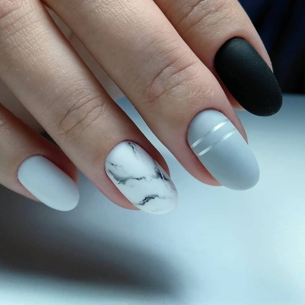 A capsule-wardrobe manicure if there ever was one. Matte white and soft grey are used along with onyx and one accent on marble and clean metallic stripe. The tidy, shorter almond silhouette keeps it practical for laptops, lifting weights, and life.