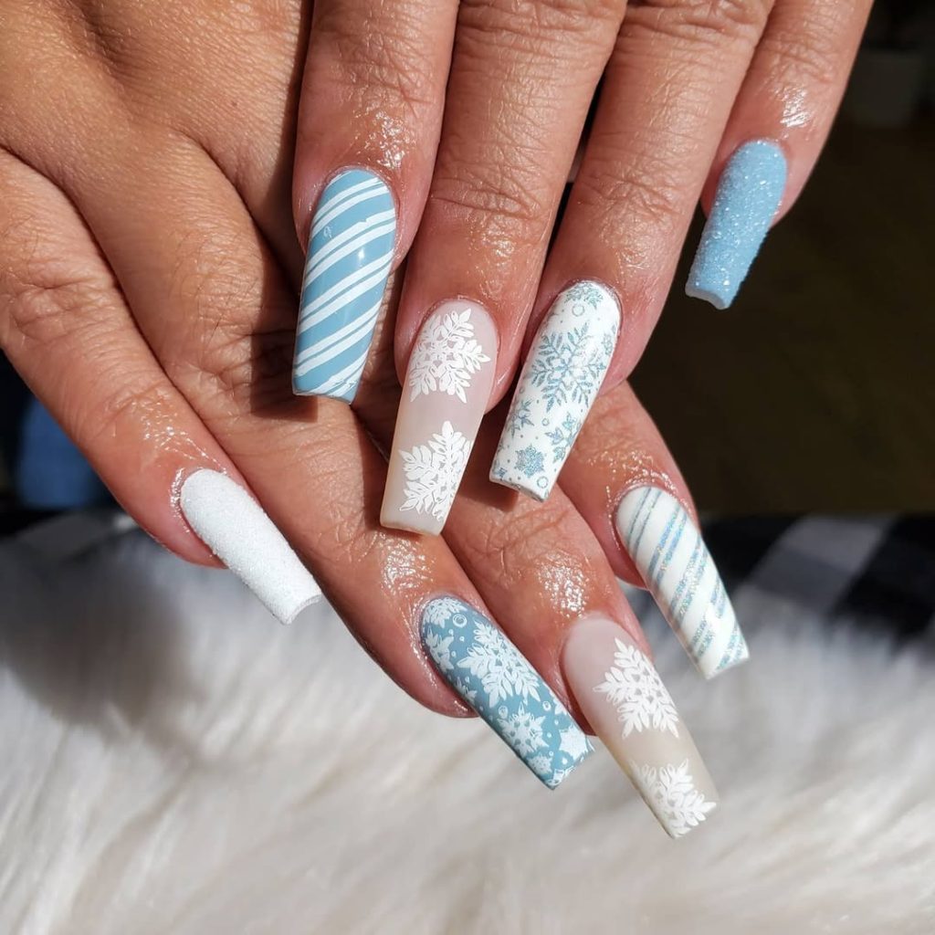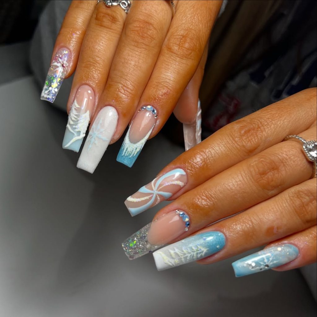 Long coffin acrylics go full snow-globe: sugar-textured whites, powder-blue fades, and clear panels dotted with crystals. Fine-line snowflakes and ribbon motifs add movement while a single glitter block keeps things party-ready.
