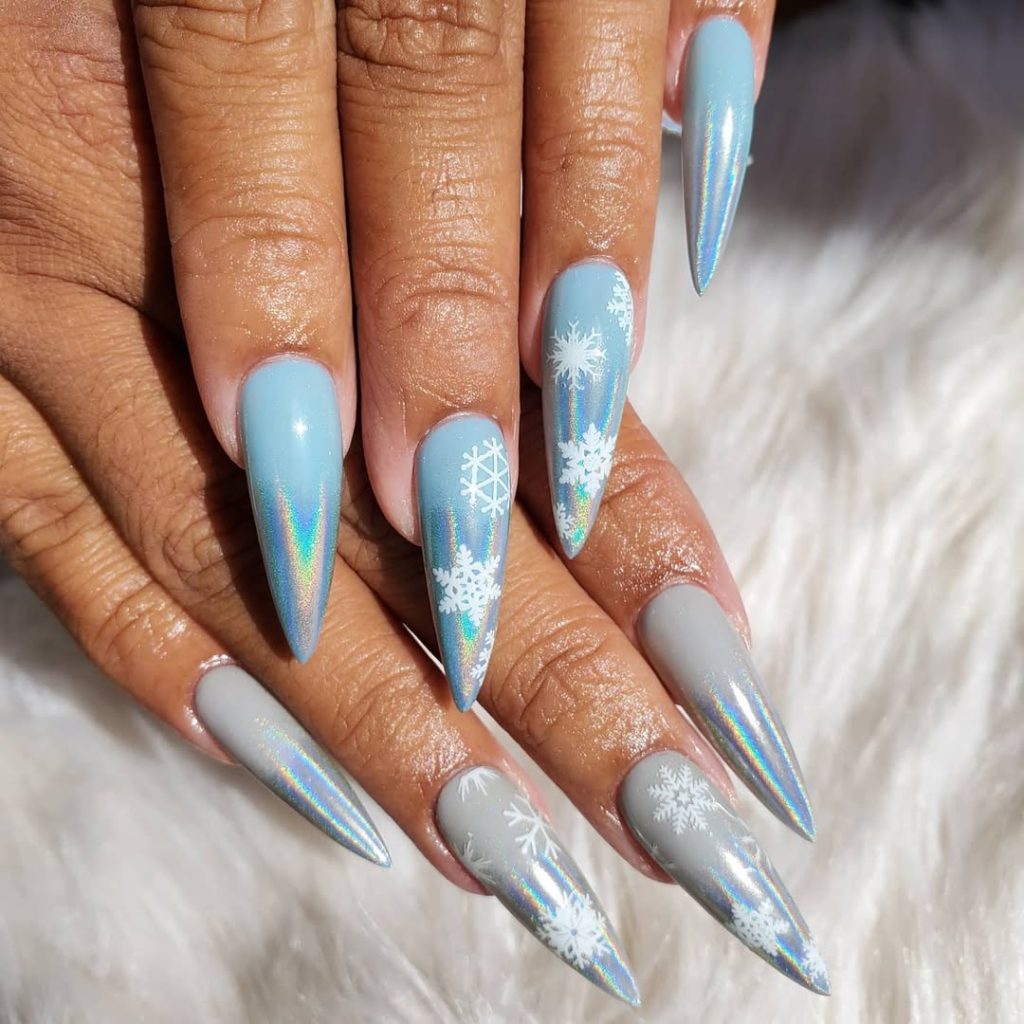 Holographic Ice: Blue-Grey Chrome with Snowflakes
