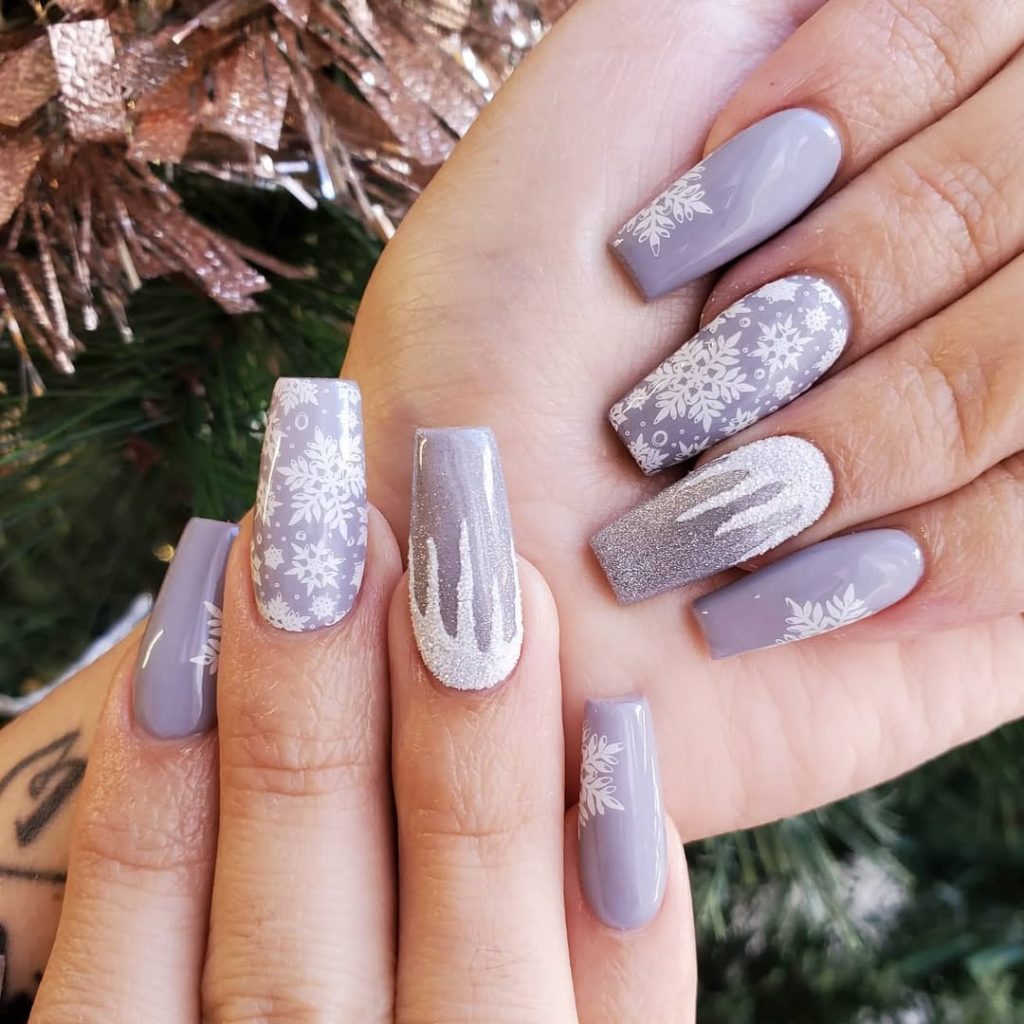 Cool greige is the quiet-luxury neutral of winter, and it’s elevated here with layered white snowflakes and two “sugar” nails that look dusted in fresh powder. The long coffin silhouette keeps the set sleek while the frosted texture adds depth—think satin slip dress under a wool coat.