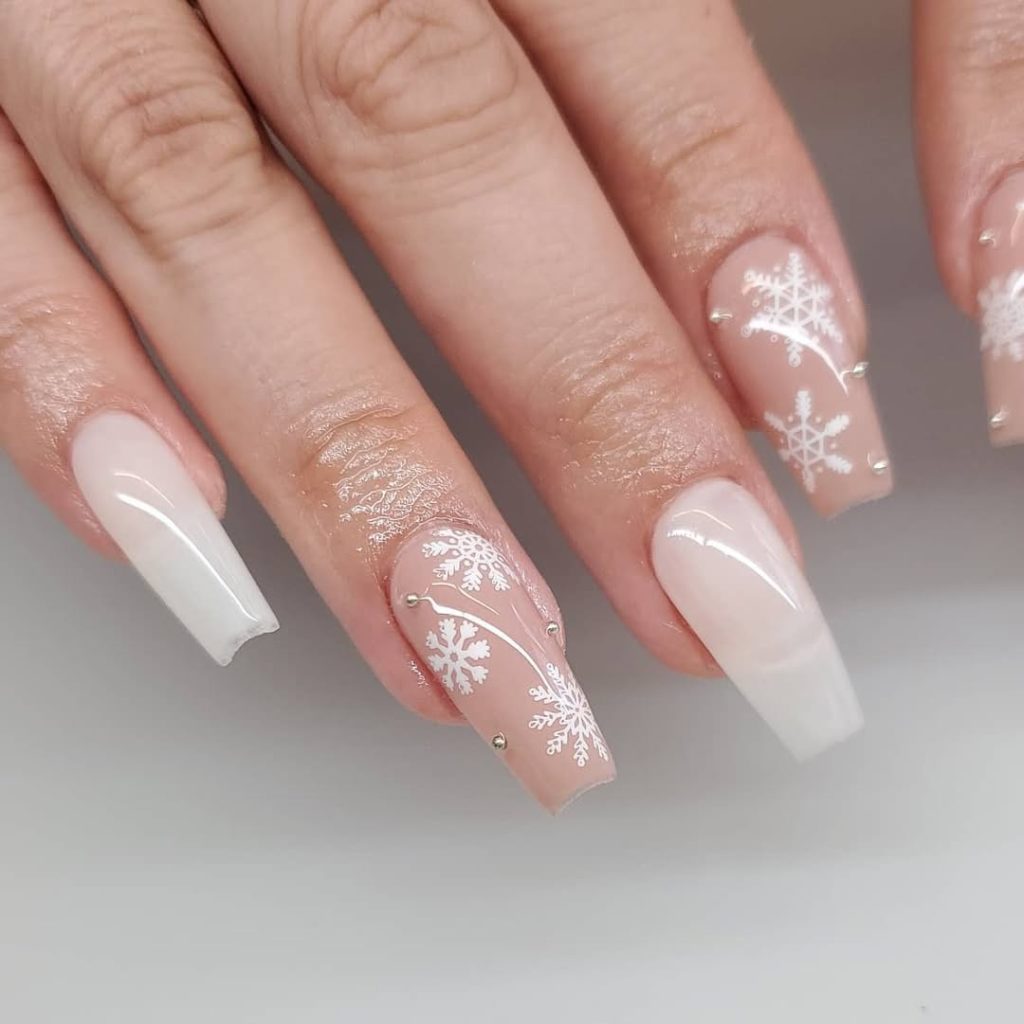 Soft-nude fades into milky white for a baby-boomer effect that reads like a whisper of a French tip. The small snowflakes are shaping in two nails with micro-studs which are positioned like stars. On medium square acrylics, it’s the definition of office-friendly seasonal art.