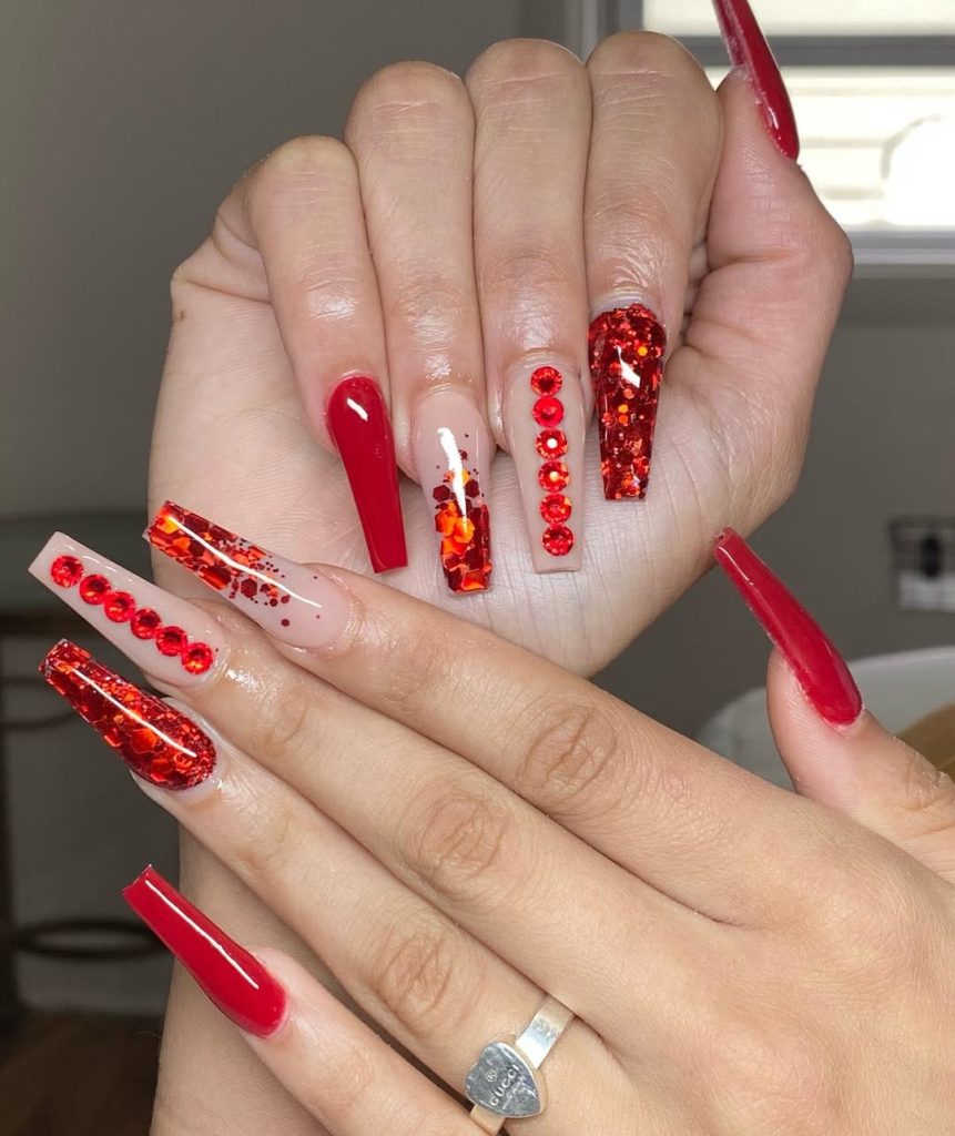 High-impact and unapologetically glam: rich gel scarlet, encapsulated glitter, and a vertical line of red crystals. The ultra-long coffin shape allows stones room to shine. If your winter calendar tilts toward galas or Vegas weekends, this is the power move.
