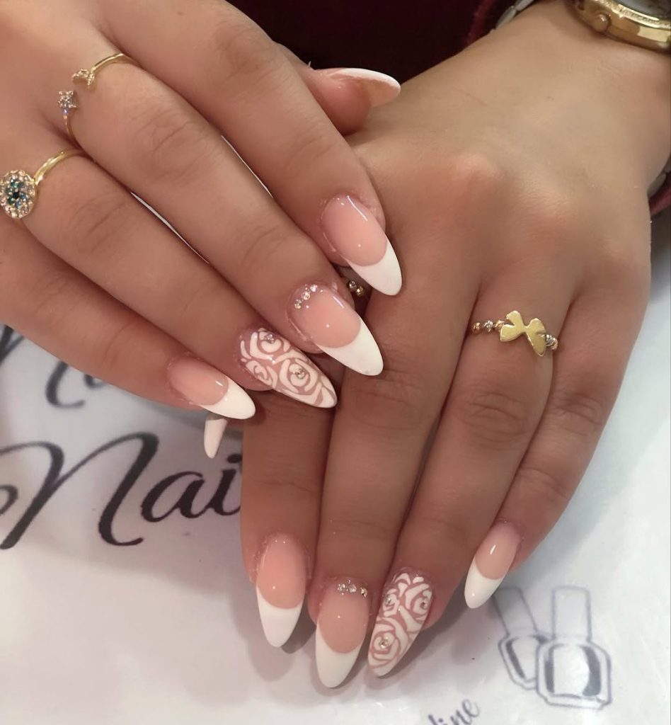 A timeless French tip on a softly tapered almond is the equivalent of a silk blouse—always appropriate, always elegant. Two nails carry etched white roses and a whisper of sparkle at the cuticle for a romantic twist that works from boardroom to date night.