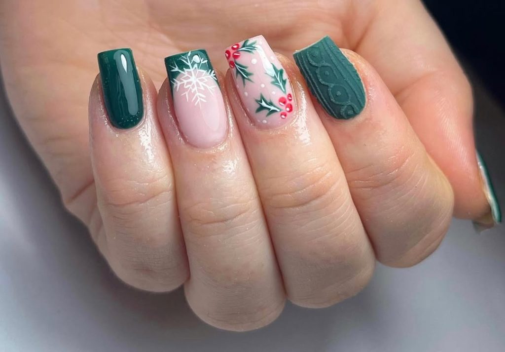 A chic woodland palette: glossy pine, a knit-textured ring finger, a crisp snowflake, and hand-painted holly berries. On practical Short square nails, the look reads festive yet wearable for school pickups, spreadsheets, and everything in between.