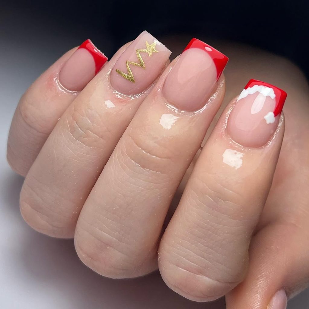 A glossy nude base gets a merry upgrade with crisp cherry-red bands on tidy, Short square tips. One nail replaces the stripe with a thin metallic tree and star–festive but still boardroom-friendly and another nail has a snowy drip to add just a touch of flair. It’s the holiday party you can wear to Monday’s meeting.